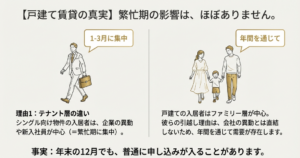 なぜなら戸建ての場合、割と年中賃貸需要が